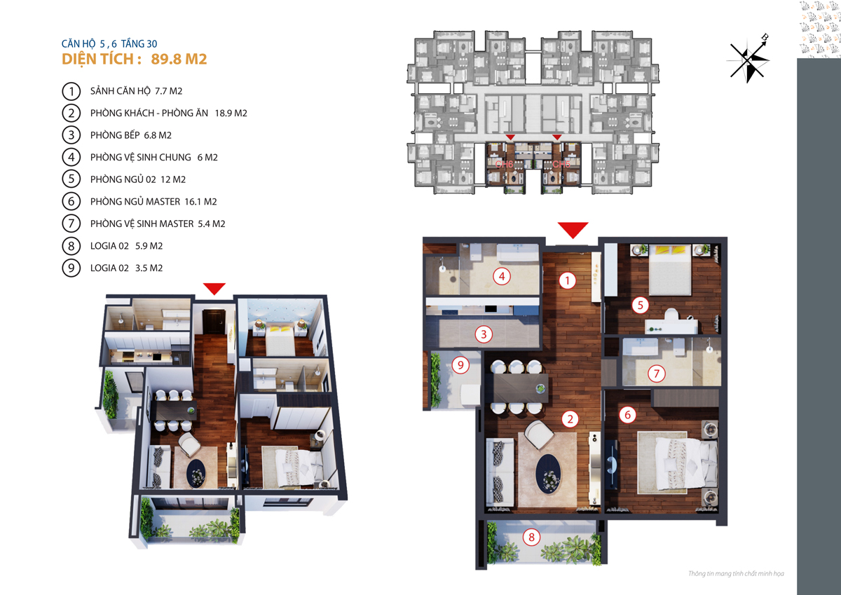 – Căn hộ 2 phòng ngủ: 89.8 m2